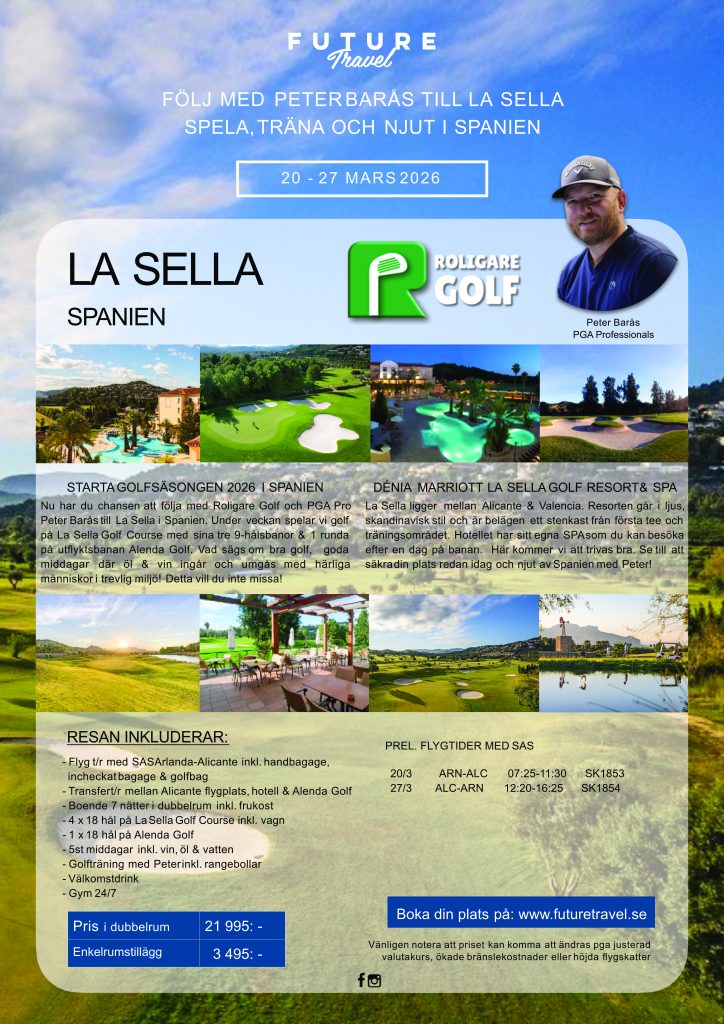 Jag vill även passa på att bjuda in till en tränings- och spelresa till La Sella i Spanien. Resan är den 20-27 mars 2026 och flyget går från Arlanda. Det blir en vecka fylld av golfträning, spel på banan och gemenskap i härlig miljö. Se roligaregolf.se/golfresor/ för mer om resan. I vinter inomhus på Peters Golf & Kaffi, Färjeleden 7 i Visby, erbjuds möjligheter till spel, träning och utprovning av golfklubbor. Dessutom kommer vi ha olika aktiviteter som passar alla. Vi satsar extra på alla 55+ med seriespel varje måndag. Läs mer på www.petersgolfochkaffi.se/